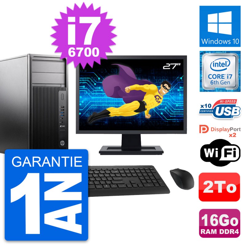 PC Tour HP WorkStation Z240 MT - Intel Core i7-6700 3.4 Ghz (8 Mo) - 16 Go DDR4 - Disque Dur 3,5" 2 To - Clef Wifi USB - Windows 10 - Livré avec Ecran 27" + clavier + souris (Marques et modèles variables) - Garantie 1 an.