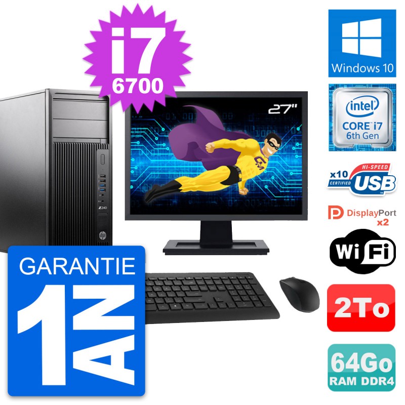 PC Tour HP WorkStation Z240 MT - Intel Core i7-6700 3.4 Ghz (8 Mo) - 64 Go DDR4 - Disque Dur 3,5" 2 To - Clef Wifi USB - Windows 10 - Livré avec Ecran 27" + clavier + souris (Marques et modèles variables) - Garantie 1 an.