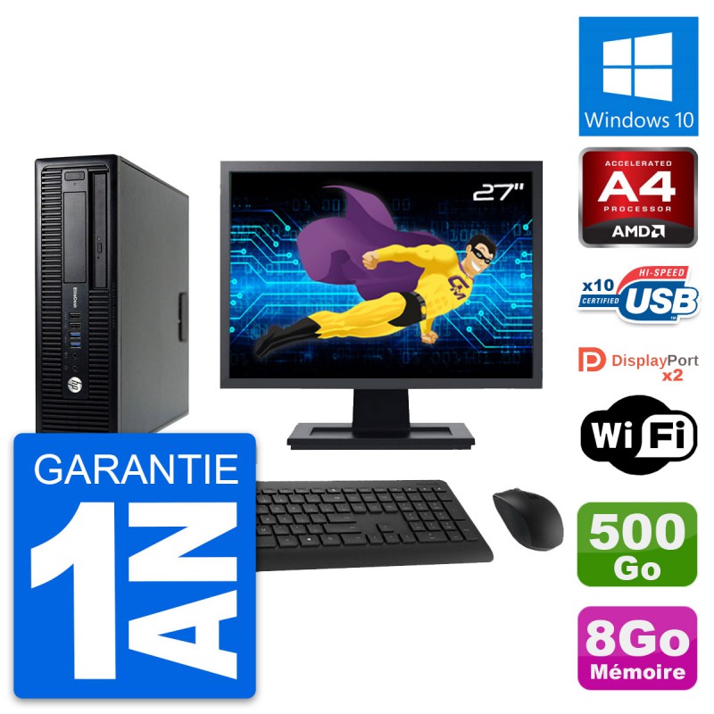 PC HP EliteDesk 705 G1 SFF - AMD A4 PRO-7300B 3.8 Ghz (1 Mo) - 8 Go DDR3 - Disque Dur 3,5" 500 Go - Graveur DVD - Clef Wifi USB - Windows 10 - Livré avec Ecran 27" + clavier + souris (Marques et modèles variables) - Garantie 1 an.