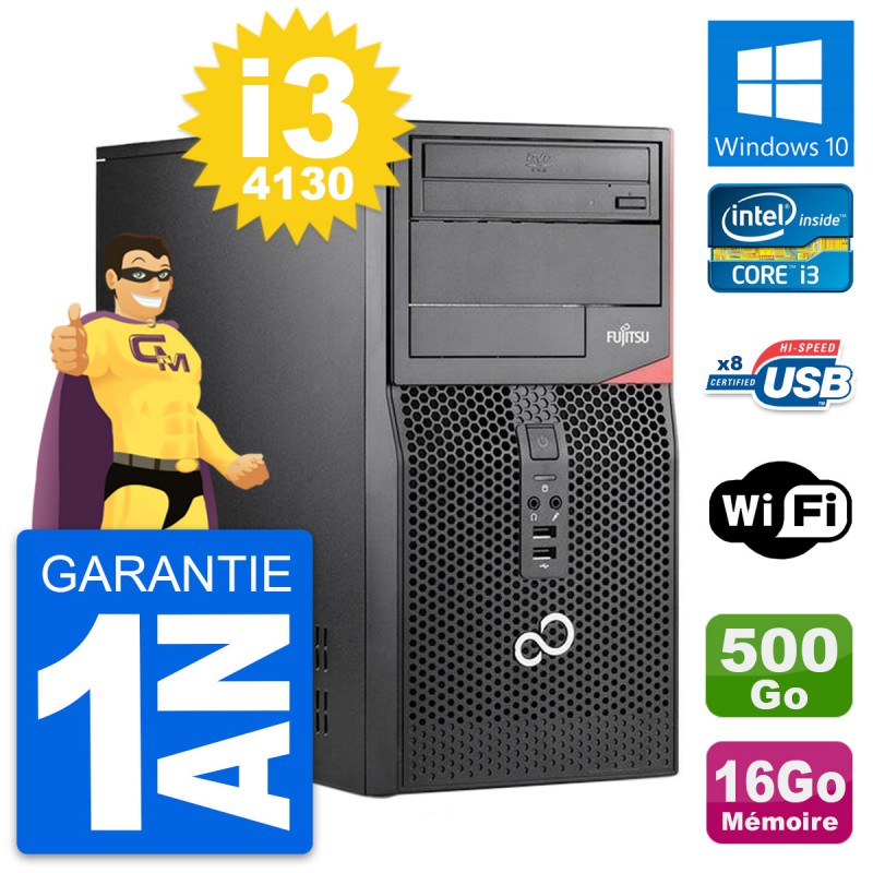 PC Tour Fujitsu Esprimo P520 - Intel Core i3-4130 3.4 Ghz (3 Mo) - 16 Go DDR3 - Disque Dur 3,5" 500 Go - Graveur DVD - Clef Wifi USB - Windows 10 - Garantie 1 an.