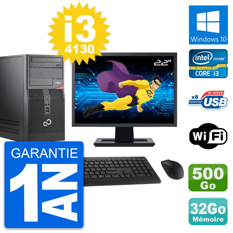 PC Tour Fujitsu Esprimo P520 - Intel Core i3-4130 3.4 Ghz (3 Mo) - 32 Go DDR3 - Disque Dur 3,5" 500 Go - Graveur DVD - Clef Wifi USB - Windows 10 - Livré avec Ecran 22" + clavier + souris (Marques et modèles variables) - Garantie 1 an.