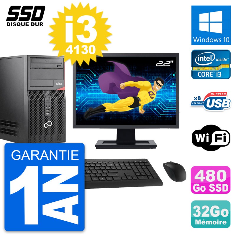 PC Tour Fujitsu Esprimo P520 - Intel Core i3-4130 3.4 Ghz (3 Mo) - 32 Go DDR3 - SSD 480 Go - Graveur DVD - Clef Wifi USB - Windows 10 - Livré avec Ecran 22" + clavier + souris (Marques et modèles variables) - Garantie 1 an.