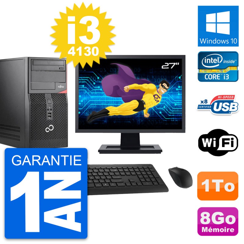 PC Tour Fujitsu Esprimo P520 - Intel Core i3-4130 3.4 Ghz (3 Mo) - 8 Go DDR3 - Disque Dur 3,5" 1 To - Graveur DVD - Clef Wifi USB - Windows 10 - Livré avec Ecran 27" + clavier + souris (Marques et modèles variables) - Garantie 1 an.