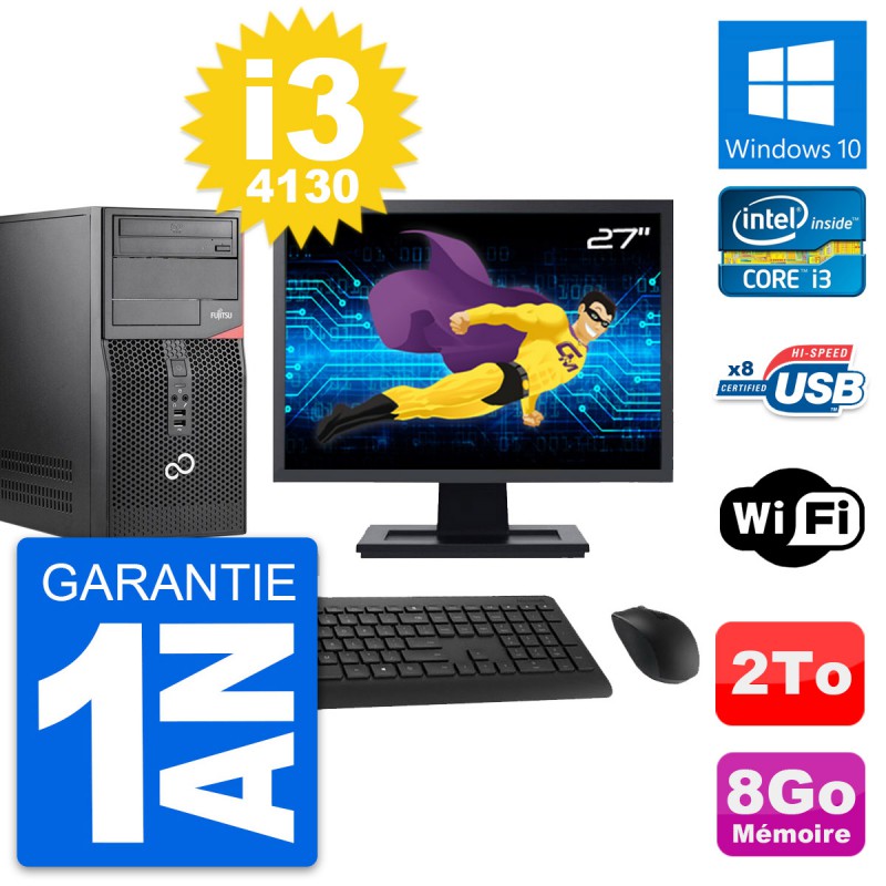 PC Tour Fujitsu Esprimo P520 - Intel Core i3-4130 3.4 Ghz (3 Mo) - 8 Go DDR3 - Disque Dur 3,5" 2 To - Graveur DVD - Clef Wifi USB - Windows 10 - Livré avec Ecran 27" + clavier + souris (Marques et modèles variables) - Garantie 1 an.