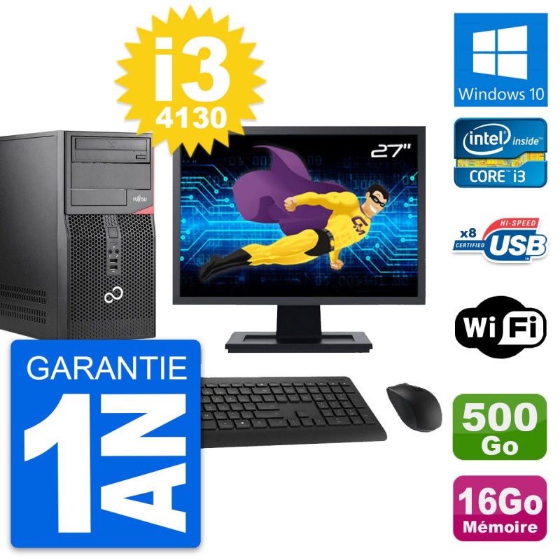 PC Tour Fujitsu Esprimo P520 - Intel Core i3-4130 3.4 Ghz (3 Mo) - 16 Go DDR3 - Disque Dur 3,5" 500 Go - Graveur DVD - Clef Wifi USB - Windows 10 - Livré avec Ecran 27" + clavier + souris (Marques et modèles variables) - Garantie 1 an.