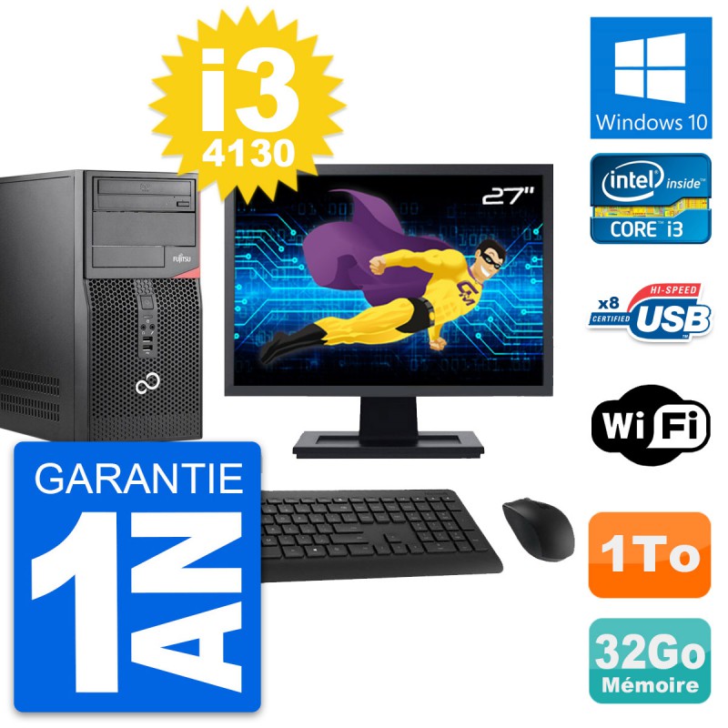 PC Tour Fujitsu Esprimo P520 - Intel Core i3-4130 3.4 Ghz (3 Mo) - 32 Go DDR3 - Disque Dur 3,5" 1 To - Graveur DVD - Clef Wifi USB - Windows 10 - Livré avec Ecran 27" + clavier + souris (Marques et modèles variables) - Garantie 1 an.