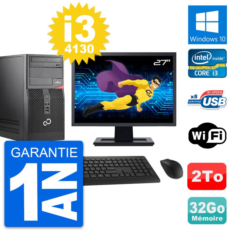 PC Tour Fujitsu Esprimo P520 - Intel Core i3-4130 3.4 Ghz (3 Mo) - 32 Go DDR3 - Disque Dur 3,5" 2 To - Graveur DVD - Clef Wifi USB - Windows 10 - Livré avec Ecran 27" + clavier + souris (Marques et modèles variables) - Garantie 1 an.