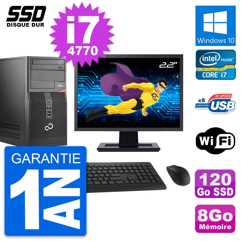 PC Tour Fujitsu Esprimo P520 - Intel Core i7-4770 3.4 Ghz (8 Mo) - 8 Go DDR3 - SSD 120 Go - Graveur DVD - Clef Wifi USB - Windows 10 - Livré avec Ecran 22" + clavier + souris (Marques et modèles variables) - Garantie 1 an.