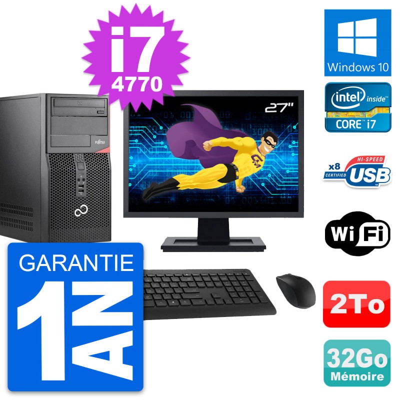 PC Tour Fujitsu Esprimo P520 - Intel Core i7-4770 3.4 Ghz (8 Mo) - 32 Go DDR3 - Disque Dur 3,5" 2 To - Graveur DVD - Clef Wifi USB - Windows 10 - Livré avec Ecran 27" + clavier + souris (Marques et modèles variables) - Garantie 1 an.