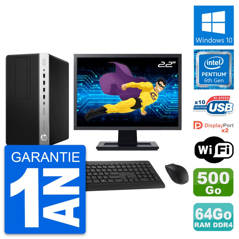 PC Tour HP ProDesk 600 G3 MT - Intel Pentium Dual-Core G4400 3.3 Ghz (3 Mo) - 64 Go DDR4 - Disque Dur 3,5" 500 Go - Clef Wifi USB - Windows 10 - Livré avec Ecran 22" + clavier + souris (Marques et modèles variables) - Garantie 1 an.