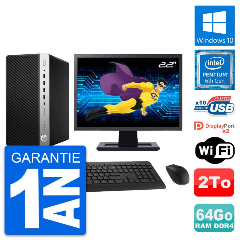PC Tour HP ProDesk 600 G3 MT - Intel Pentium Dual-Core G4400 3.3 Ghz (3 Mo) - 64 Go DDR4 - Disque Dur 3,5" 2 To - Clef Wifi USB - Windows 10 - Livré avec Ecran 22" + clavier + souris (Marques et modèles variables) - Garantie 1 an.