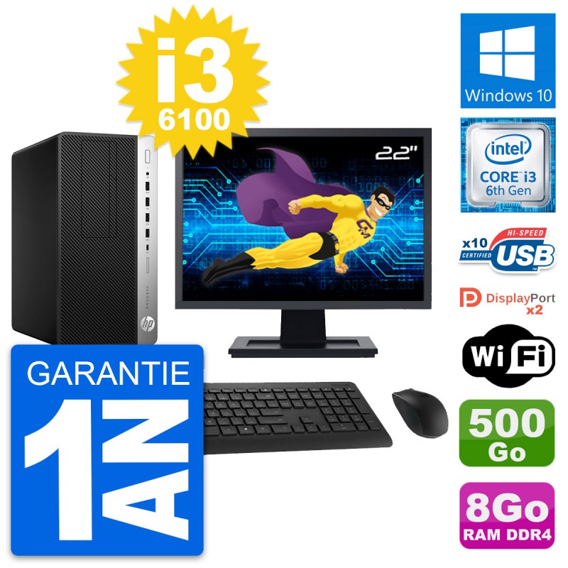 PC Tour HP ProDesk 600 G3 MT - Intel Core i3-6100 3.7 Ghz (3 Mo) - 8 Go DDR4 - Disque Dur 3,5" 500 Go - Clef Wifi USB - Windows 10 - Livré avec Ecran 22" + clavier + souris (Marques et modèles variables) - Garantie 1 an.