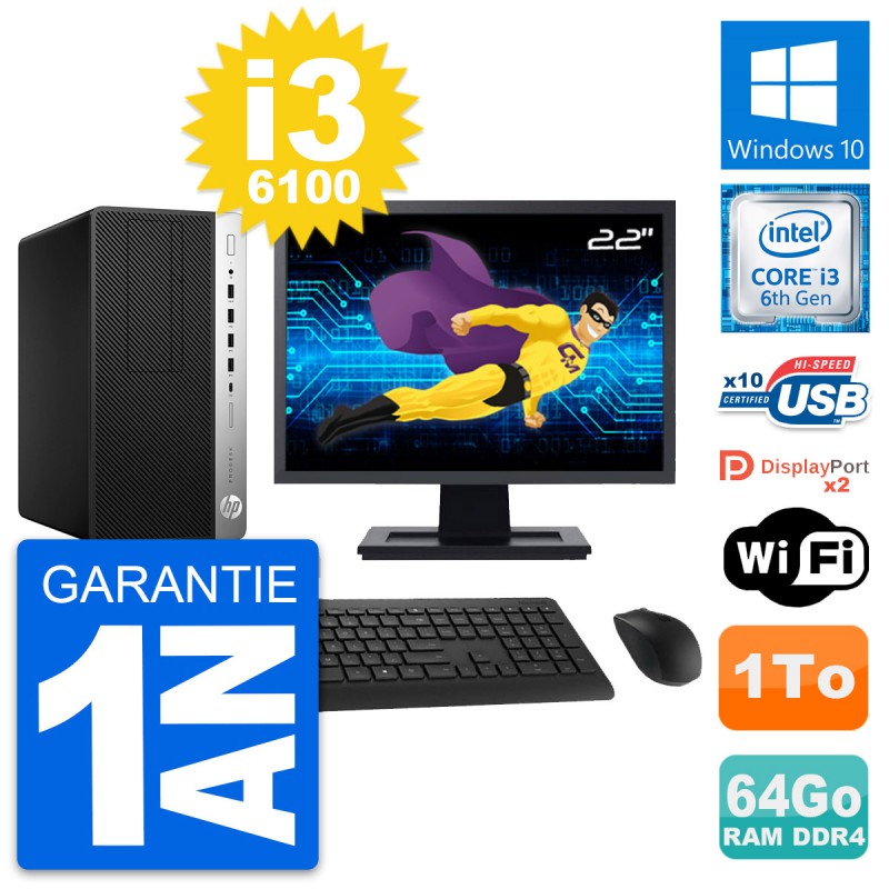 PC Tour HP ProDesk 600 G3 MT - Intel Core i3-6100 3.7 Ghz (3 Mo) - 64 Go DDR4 - Disque Dur 3,5" 1 To - Clef Wifi USB - Windows 10 - Livré avec Ecran 22" + clavier + souris (Marques et modèles variables) - Garantie 1 an.