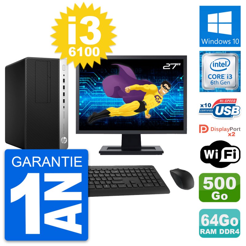 PC Tour HP ProDesk 600 G3 MT - Intel Core i3-6100 3.7 Ghz (3 Mo) - 64 Go DDR4 - Disque Dur 3,5" 500 Go - Clef Wifi USB - Windows 10 - Livré avec Ecran 27" + clavier + souris (Marques et modèles variables) - Garantie 1 an.
