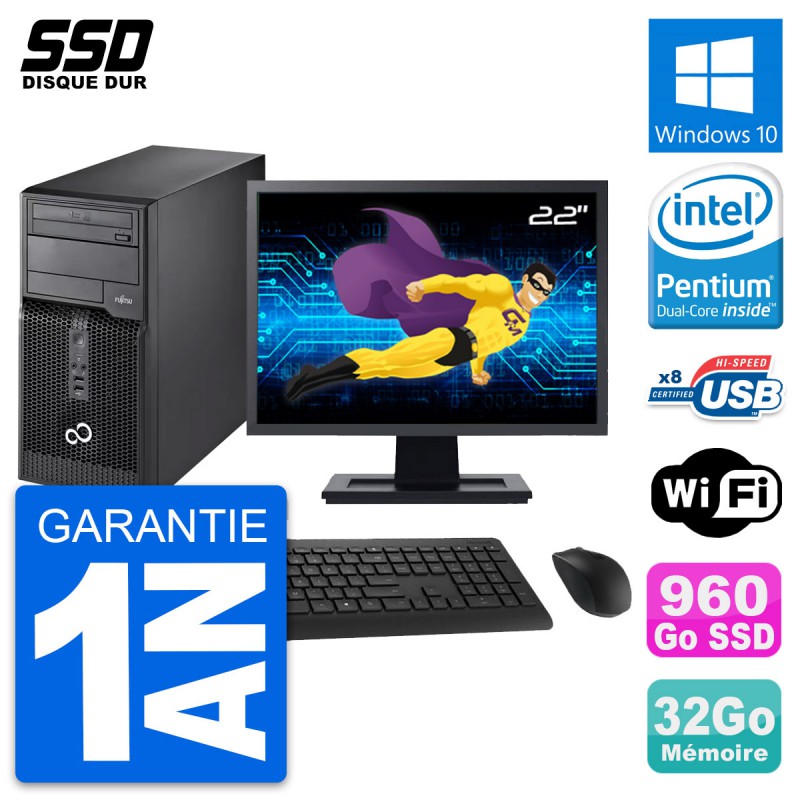 PC Tour Fujitsu Esprimo P510 MT - Intel Pentium Dual-Core G2020 2.9 Ghz (3 Mo) - 32 Go DDR3 - Disque Dur SSD 960 Go - Graveur DVD - Clef Wifi USB - Windows 10 - Livré avec Ecran 22" + clavier + souris (Marques et modèles variables) - Garantie 1 an.