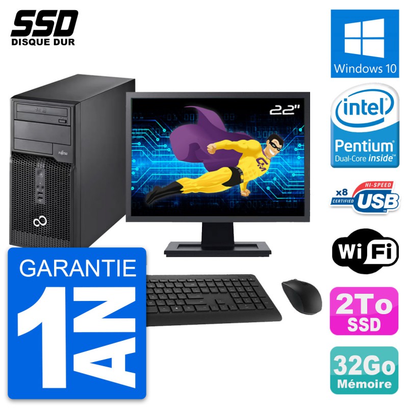 PC Tour Fujitsu Esprimo P510 MT - Intel Pentium Dual-Core G2020 2.9 Ghz (3 Mo) - 32 Go DDR3 - Disque Dur SSD 2 To - Graveur DVD - Clef Wifi USB - Windows 10 - Livré avec Ecran 22" + clavier + souris (Marques et modèles variables) - Garantie 1 an.