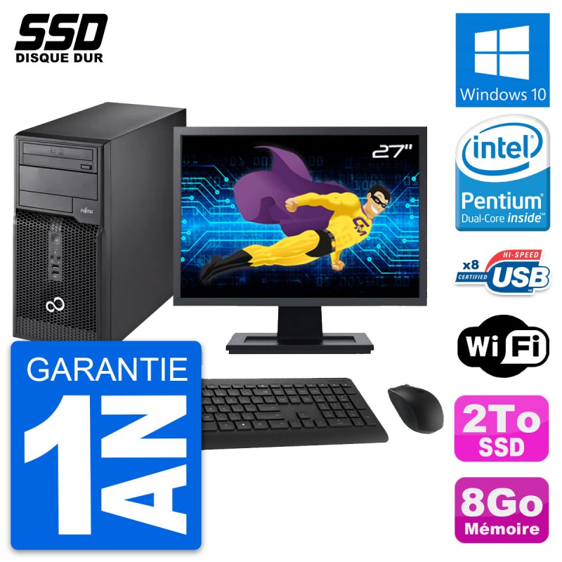 PC Tour Fujitsu Esprimo P510 MT - Intel Pentium Dual-Core G2020 2.9 Ghz (3 Mo) - 8 Go DDR3 - Disque Dur SSD 2 To - Graveur DVD - Clef Wifi USB - Windows 10 - Livré avec Ecran 27" + clavier + souris (Marques et modèles variables) - Garantie 1 an.