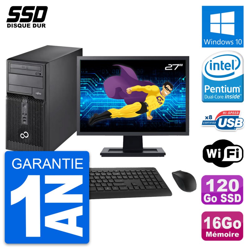 PC Tour Fujitsu Esprimo P510 MT - Intel Pentium Dual-Core G2020 2.9 Ghz (3 Mo) - 16 Go DDR3 - Disque Dur SSD 120 Go - Graveur DVD - Clef Wifi USB - Windows 10 - Livré avec Ecran 27" + clavier + souris (Marques et modèles variables) - Garantie 1 an.