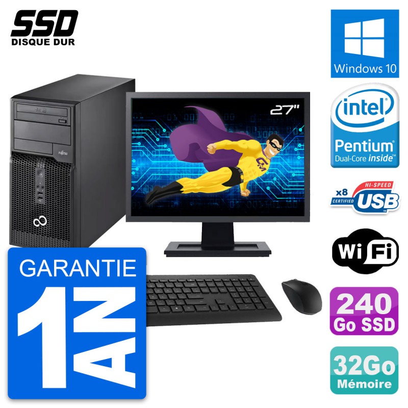 PC Tour Fujitsu Esprimo P510 MT - Intel Pentium Dual-Core G2020 2.9 Ghz (3 Mo) - 32 Go DDR3 - Disque Dur SSD 240 Go - Graveur DVD - Clef Wifi USB - Windows 10 - Livré avec Ecran 27" + clavier + souris (Marques et modèles variables) - Garantie 1 an.