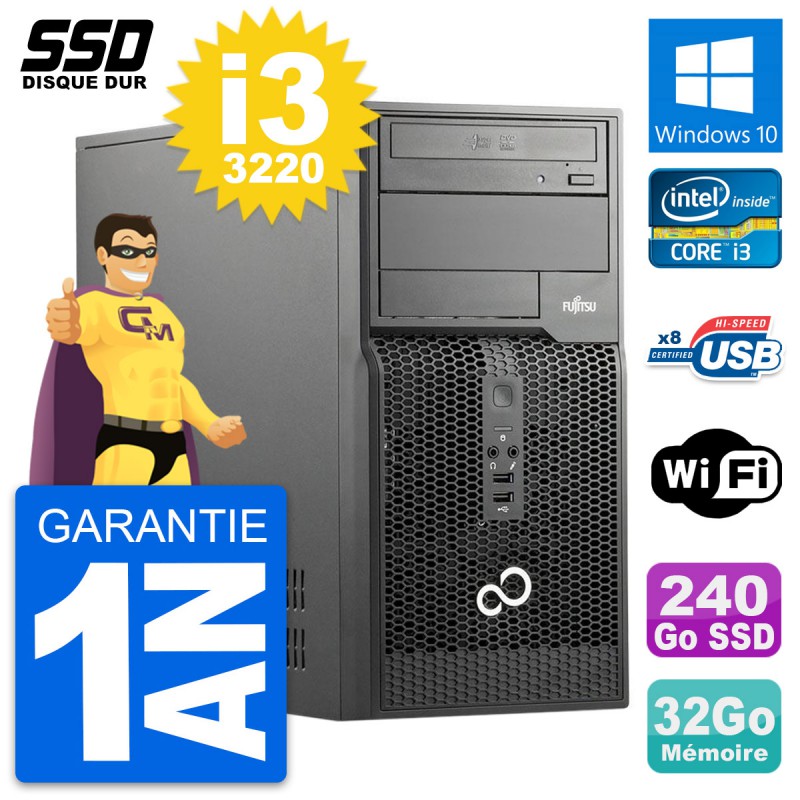 PC Tour Fujitsu Esprimo P510 MT - Intel Core i3-3220 3.3 Ghz (3 Mo) - 32 Go DDR3 - Disque Dur SSD 240 Go - Graveur DVD - Clef Wifi USB - Windows 10 - Garantie 1 an.
