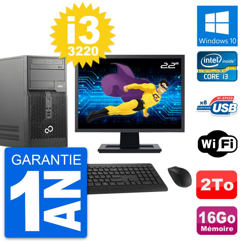PC Tour Fujitsu Esprimo P510 MT - Intel Core i3-3220 3.3 Ghz (3 Mo) - 16 Go DDR3 - Disque Dur 3,5" 2 To - Graveur DVD - Clef Wifi USB - Windows 10 - Livré avec Ecran 22" + clavier + souris (Marques et modèles variables) - Garantie 1 an.
