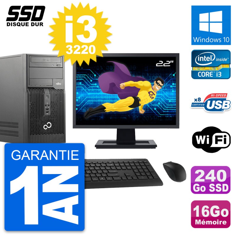 PC Tour Fujitsu Esprimo P510 MT - Intel Core i3-3220 3.3 Ghz (3 Mo) - 16 Go DDR3 - Disque Dur SSD 240 Go - Graveur DVD - Clef Wifi USB - Windows 10 - Livré avec Ecran 22" + clavier + souris (Marques et modèles variables) - Garantie 1 an.