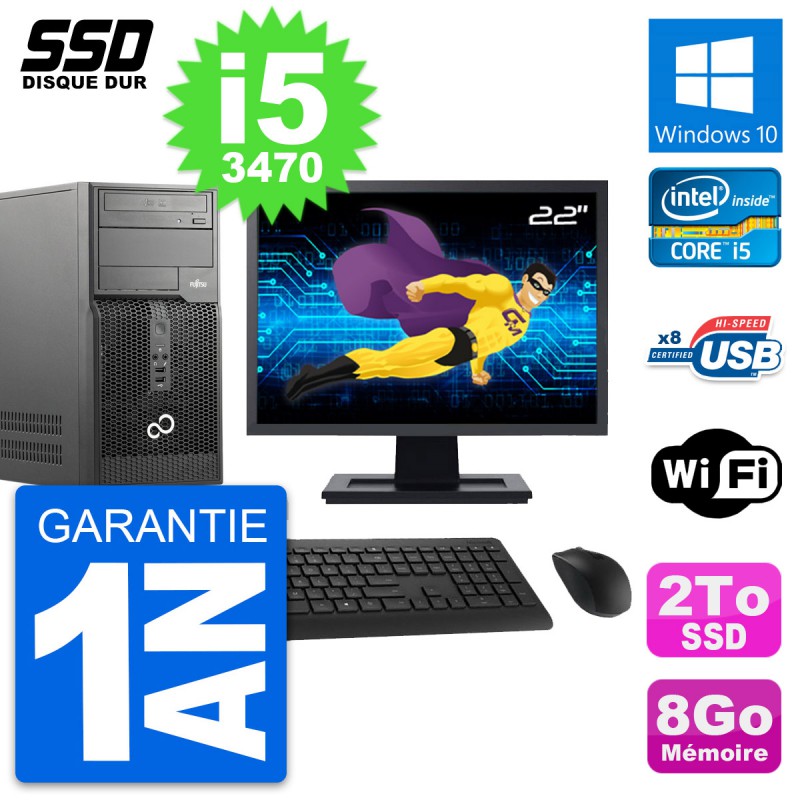 PC Tour Fujitsu Esprimo P510 MT - Intel Core i5-3470 3.2 Ghz (6 Mo) - 8 Go DDR3 - Disque Dur SSD 2 To - Graveur DVD - Clef Wifi USB - Windows 10 - Livré avec Ecran 22" + clavier + souris (Marques et modèles variables) - Garantie 1 an.