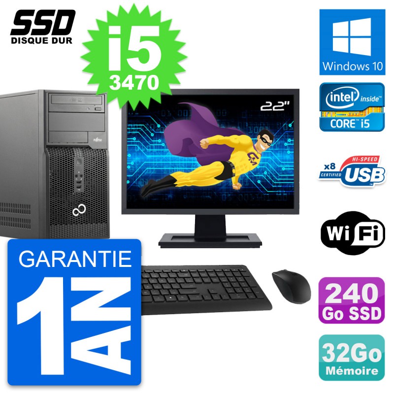 PC Tour Fujitsu Esprimo P510 MT - Intel Core i5-3470 3.2 Ghz (6 Mo) - 32 Go DDR3 - Disque Dur SSD 240 Go - Graveur DVD - Clef Wifi USB - Windows 10 - Livré avec Ecran 22" + clavier + souris (Marques et modèles variables) - Garantie 1 an.