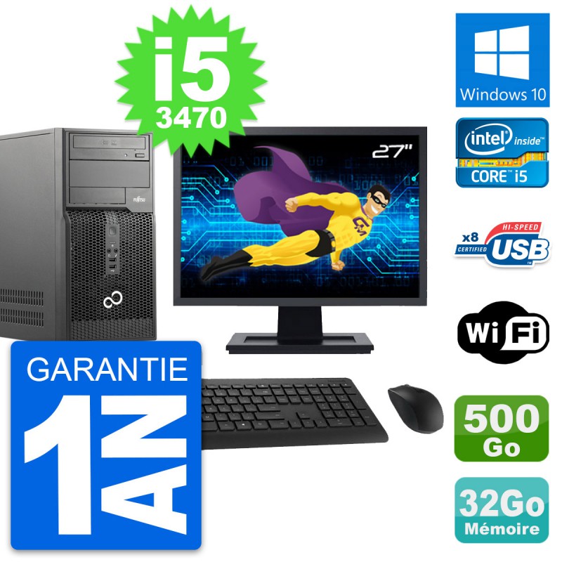 PC Tour Fujitsu Esprimo P510 MT - Intel Core i5-3470 3.2 Ghz (6 Mo) - 32 Go DDR3 - Disque Dur 3,5" 500 Go - Graveur DVD - Clef Wifi USB - Windows 10 - Livré avec Ecran 27" + clavier + souris (Marques et modèles variables) - Garantie 1 an.