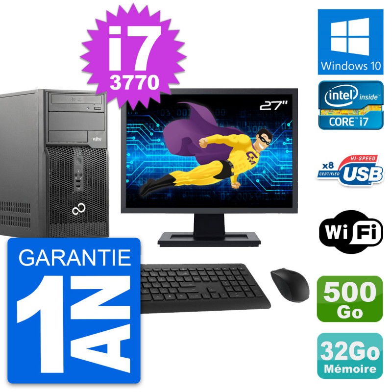 PC Tour Fujitsu Esprimo P510 MT - Intel Core i7-3770 3.4 Ghz (8 Mo) - 32 Go DDR3 - Disque Dur 3,5" 500 Go - Graveur DVD - Clef Wifi USB - Windows 10 - Livré avec Ecran 27" + clavier + souris (Marques et modèles variables) - Garantie 1 an.