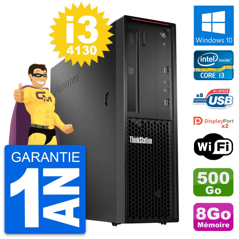 PC Lenovo ThinkStation P300 SFF - Intel Core i3-4130 3.4 Ghz (3 Mo) - 8 Go DDR3 - Disque Dur 3,5" 500 Go - Clef Wifi USB - Graveur DVD - Windows 10 - Garantie 1 an.
