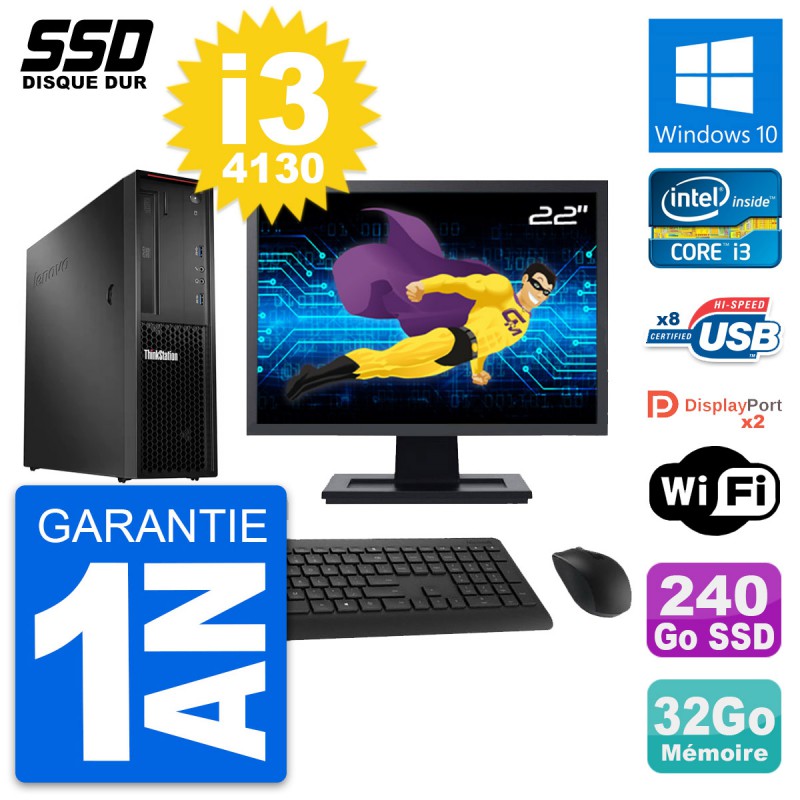 PC Lenovo ThinkStation P300 SFF - Intel Core i3-4130 3.4 Ghz (3 Mo) - 32 Go DDR3 - SSD 240 Go - Clef Wifi USB - Graveur DVD - Windows 10 - Livré avec Ecran 22" + clavier + souris (Marques et modèles variables) - Garantie 1 an.