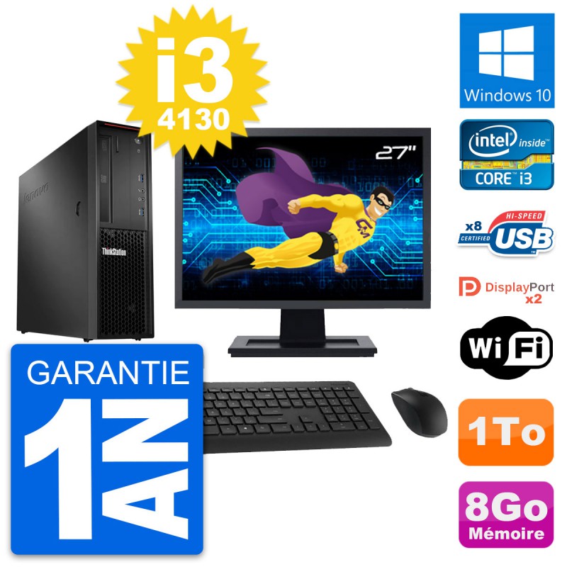 PC Lenovo ThinkStation P300 SFF - Intel Core i3-4130 3.4 Ghz (3 Mo) - 8 Go DDR3 - Disque Dur 3,5" 1 To - Clef Wifi USB - Graveur DVD - Windows 10 - Livré avec Ecran 27" + clavier + souris (Marques et modèles variables) - Garantie 1 an.