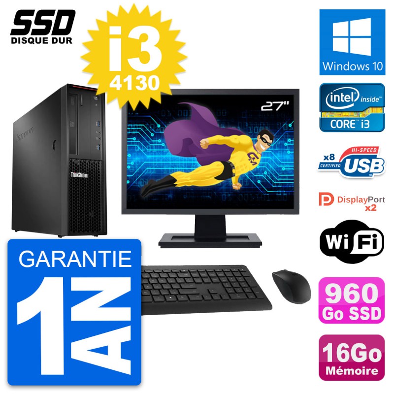 PC Lenovo ThinkStation P300 SFF - Intel Core i3-4130 3.4 Ghz (3 Mo) - 16 Go DDR3 - SSD 960 Go - Clef Wifi USB - Graveur DVD - Windows 10 - Livré avec Ecran 27" + clavier + souris (Marques et modèles variables) - Garantie 1 an.