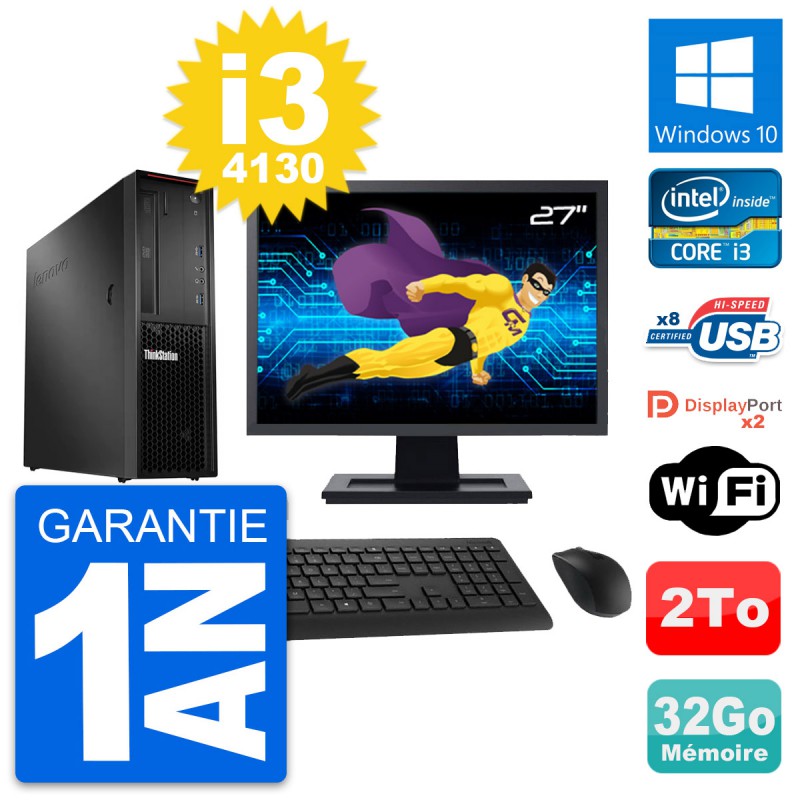 PC Lenovo ThinkStation P300 SFF - Intel Core i3-4130 3.4 Ghz (3 Mo) - 32 Go DDR3 - Disque Dur 3,5" 2 To - Clef Wifi USB - Graveur DVD - Windows 10 - Livré avec Ecran 27" + clavier + souris (Marques et modèles variables) - Garantie 1 an.