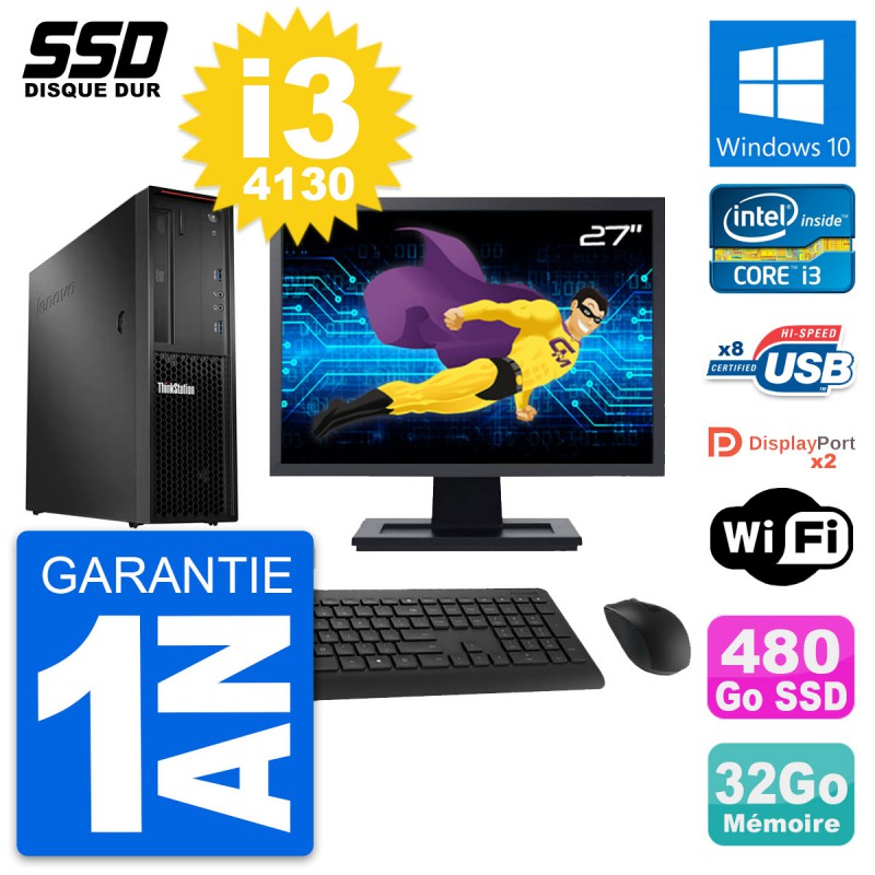 PC Lenovo ThinkStation P300 SFF - Intel Core i3-4130 3.4 Ghz (3 Mo) - 32 Go DDR3 - SSD 480 Go - Clef Wifi USB - Graveur DVD - Windows 10 - Livré avec Ecran 27" + clavier + souris (Marques et modèles variables) - Garantie 1 an.