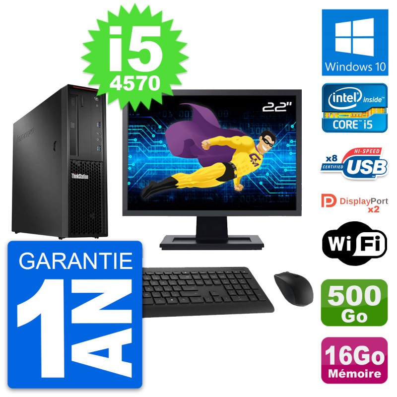 PC Lenovo ThinkStation P300 SFF - Intel Core i5-4570 3.2 Ghz (6 Mo) - 16 Go DDR3 - Disque Dur 3,5" 500 Go - Clef Wifi USB - Graveur DVD - Windows 10 - Livré avec Ecran 22" + clavier + souris (Marques et modèles variables) - Garantie 1 an.