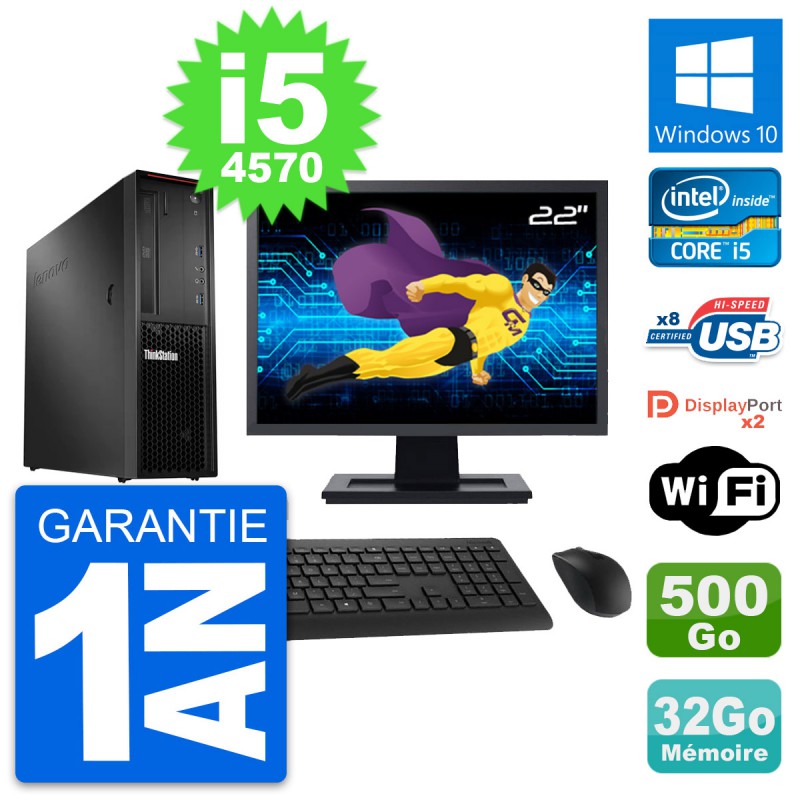 PC Lenovo ThinkStation P300 SFF - Intel Core i5-4570 3.2 Ghz (6 Mo) - 32 Go DDR3 - Disque Dur 3,5" 500 Go - Clef Wifi USB - Graveur DVD - Windows 10 - Livré avec Ecran 22" + clavier + souris (Marques et modèles variables) - Garantie 1 an.