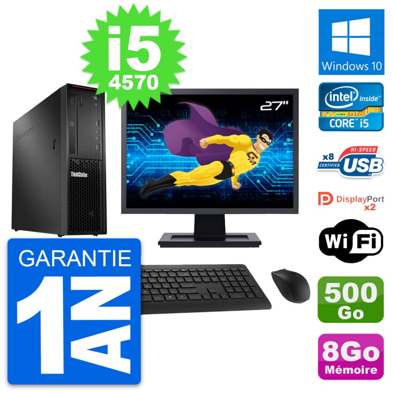 PC Lenovo ThinkStation P300 SFF - Intel Core i5-4570 3.2 Ghz (6 Mo) - 8 Go DDR3 - Disque Dur 3,5" 500 Go - Clef Wifi USB - Graveur DVD - Windows 10 - Livré avec Ecran 27" + clavier + souris (Marques et modèles variables) - Garantie 1 an.