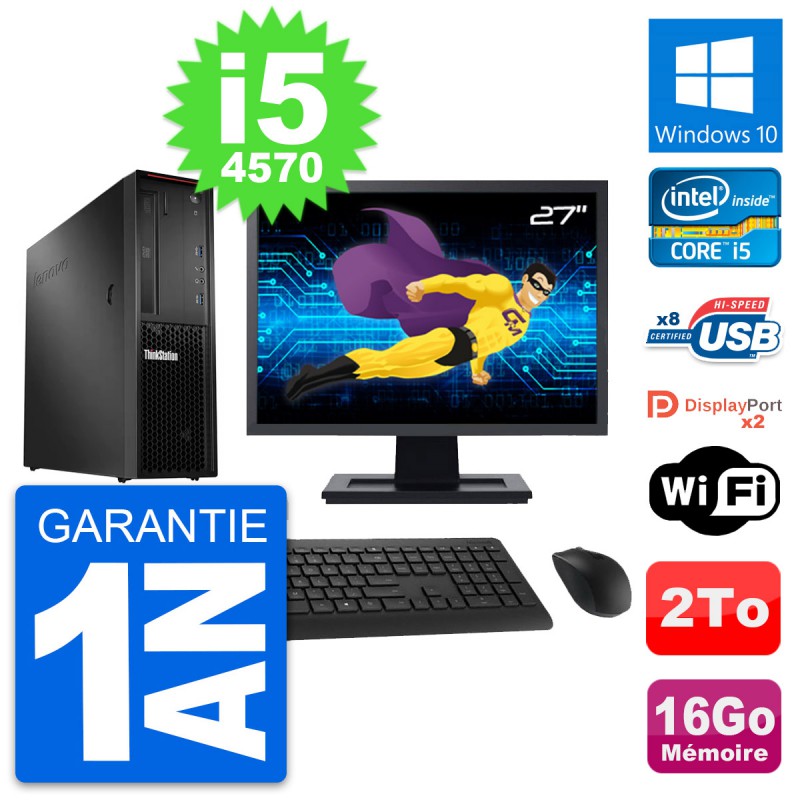 PC Lenovo ThinkStation P300 SFF - Intel Core i5-4570 3.2 Ghz (6 Mo) - 16 Go DDR3 - Disque Dur 3,5" 2 To - Clef Wifi USB - Graveur DVD - Windows 10 - Livré avec Ecran 27" + clavier + souris (Marques et modèles variables) - Garantie 1 an.