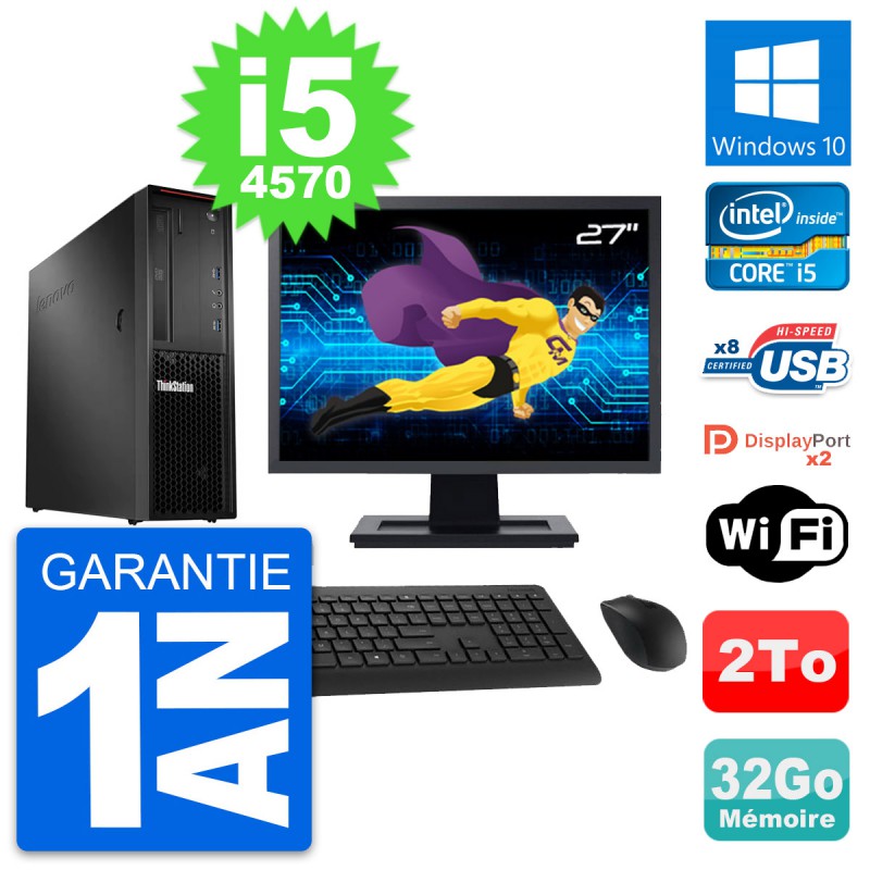 PC Lenovo ThinkStation P300 SFF - Intel Core i5-4570 3.2 Ghz (6 Mo) - 32 Go DDR3 - Disque Dur 3,5" 2 To - Clef Wifi USB - Graveur DVD - Windows 10 - Livré avec Ecran 27" + clavier + souris (Marques et modèles variables) - Garantie 1 an.