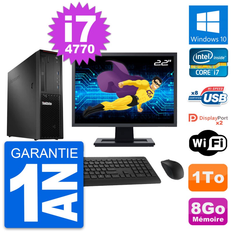 PC Lenovo ThinkStation P300 SFF - Intel Core i7-4770 3.4 Ghz (8 Mo) - 8 Go DDR3 - Disque Dur 3,5" 1 To - Clef Wifi USB - Graveur DVD - Windows 10 - Livré avec Ecran 22" + clavier + souris (Marques et modèles variables) - Garantie 1 an.