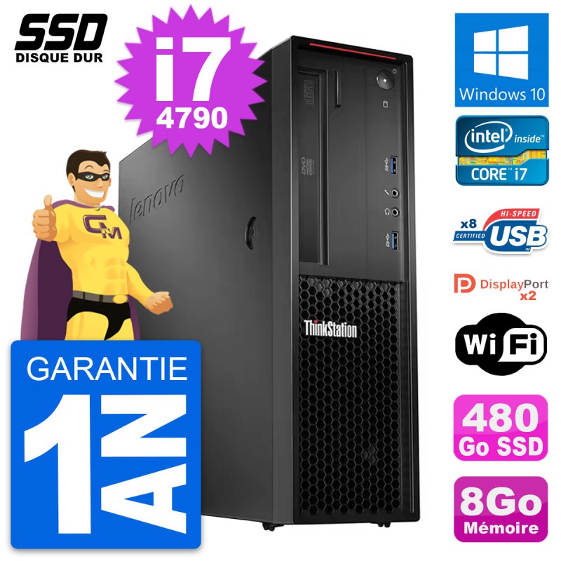 PC Lenovo ThinkStation P300 SFF - Intel Core i7-4790 3.6 Ghz (8 Mo) - 8 Go DDR3 - SSD 480 Go - Clef Wifi USB - Graveur DVD - Windows 10 - Garantie 1 an.