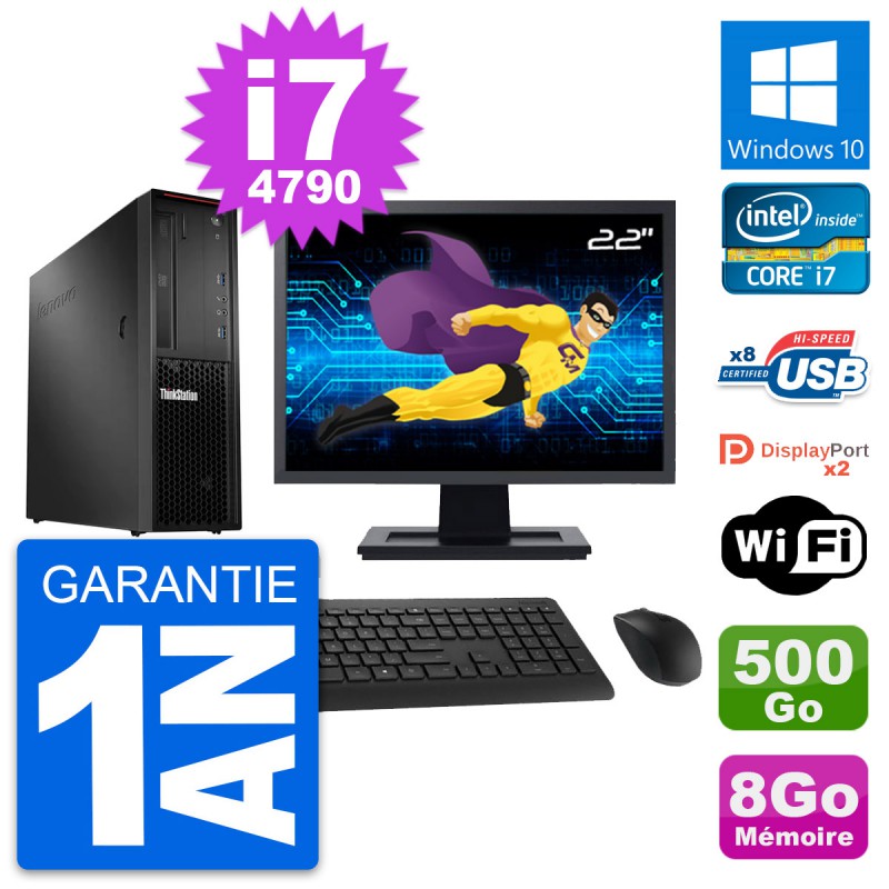 PC Lenovo ThinkStation P300 SFF - Intel Core i7-4790 3.6 Ghz (8 Mo) - 8 Go DDR3 - Disque Dur 3,5" 500 Go - Clef Wifi USB - Graveur DVD - Windows 10 - Livré avec Ecran 22" + clavier + souris (Marques et modèles variables) - Garantie 1 an.