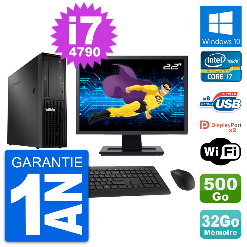 PC Lenovo ThinkStation P300 SFF - Intel Core i7-4790 3.6 Ghz (8 Mo) - 32 Go DDR3 - Disque Dur 3,5" 500 Go - Clef Wifi USB - Graveur DVD - Windows 10 - Livré avec Ecran 22" + clavier + souris (Marques et modèles variables) - Garantie 1 an.