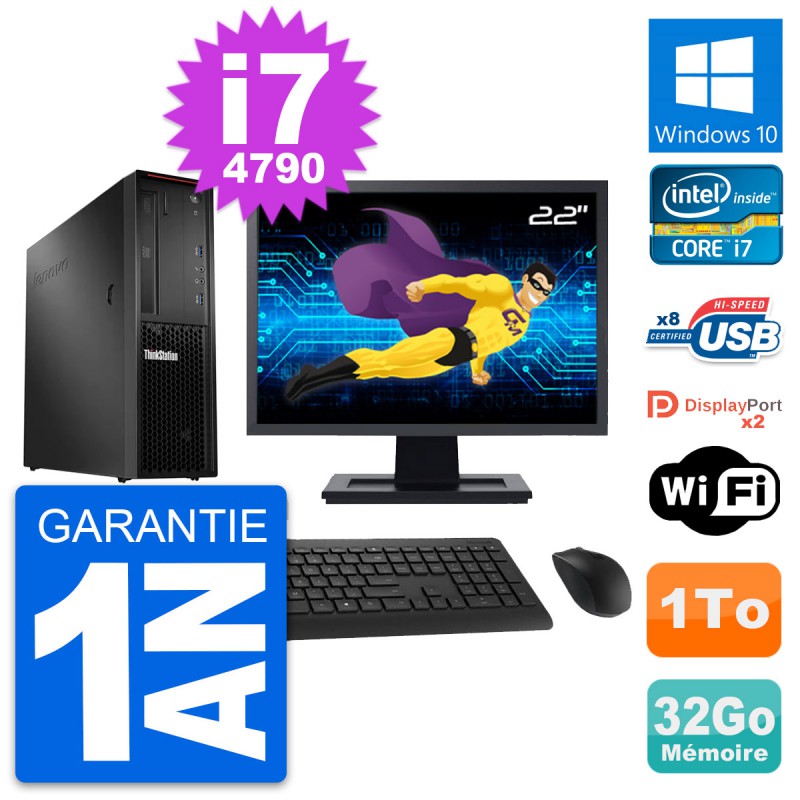 PC Lenovo ThinkStation P300 SFF - Intel Core i7-4790 3.6 Ghz (8 Mo) - 32 Go DDR3 - Disque Dur 3,5" 1 To - Clef Wifi USB - Graveur DVD - Windows 10 - Livré avec Ecran 22" + clavier + souris (Marques et modèles variables) - Garantie 1 an.