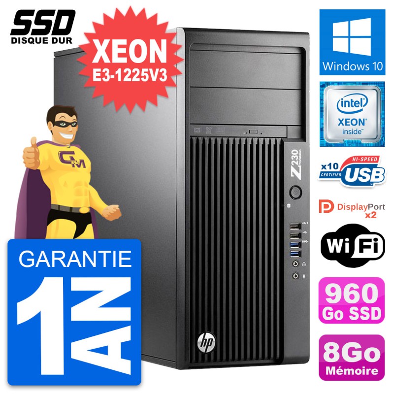 PC Tour HP WorkStation Z230 MT - Intel Xeon E3-1225 V3 3.2 Ghz (8 Mo) - 8 Go DDR3 - SSD 960 Go - Graveur DVD - Clef Wifi USB - Windows 10 - Garantie 1 an.