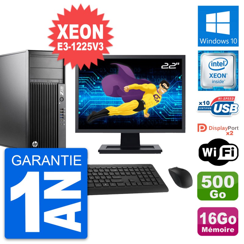 PC Tour HP WorkStation Z230 MT - Intel Xeon E3-1225 V3 3.2 Ghz (8 Mo) - 16 Go DDR3 - Disque Dur 3,5" 500 Go - Graveur DVD - Clef Wifi USB - Windows 10 - Livré avec Ecran 22" + clavier + souris (Marques et modèles variables) - Garantie 1 an.