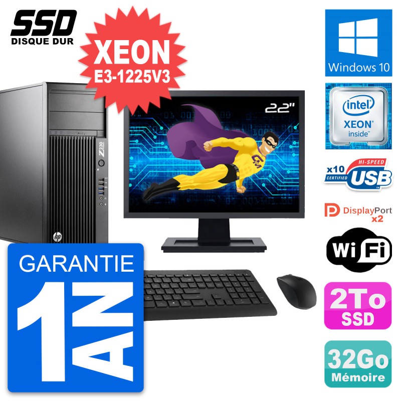 PC Tour HP WorkStation Z230 MT - Intel Xeon E3-1225 V3 3.2 Ghz (8 Mo) - 32 Go DDR3 - SSD 2 To - Graveur DVD - Clef Wifi USB - Windows 10 - Livré avec Ecran 22" + clavier + souris (Marques et modèles variables) - Garantie 1 an.