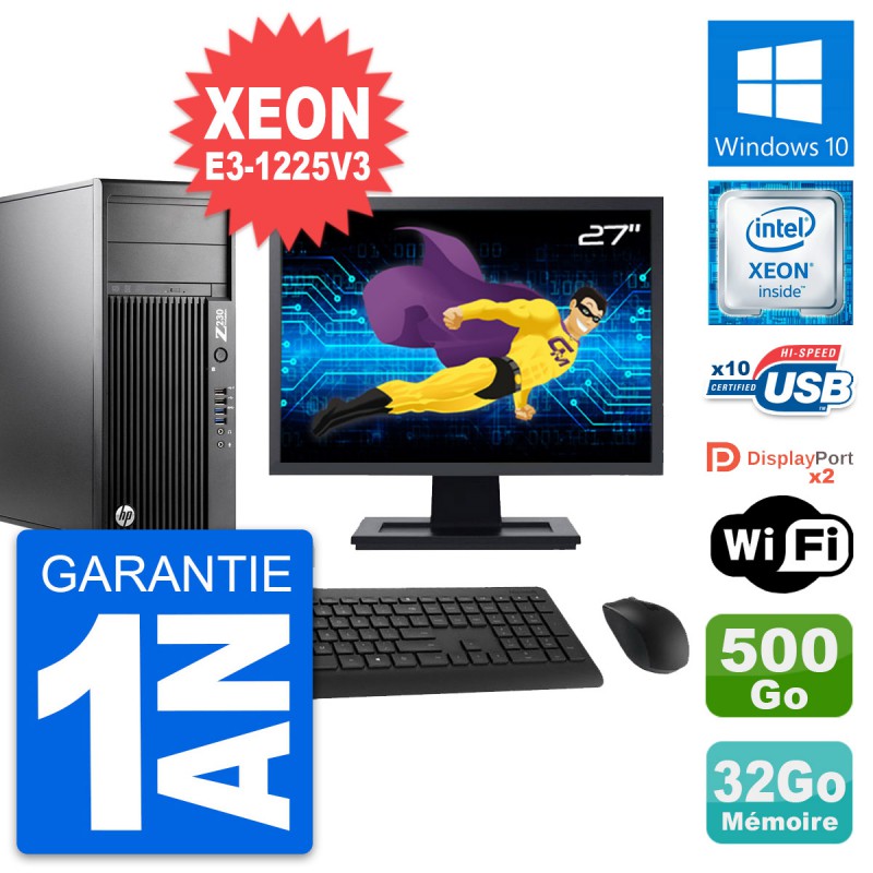 PC Tour HP WorkStation Z230 MT - Intel Xeon E3-1225 V3 3.2 Ghz (8 Mo) - 32 Go DDR3 - Disque Dur 3,5" 500 Go - Graveur DVD - Clef Wifi USB - Windows 10 - Livré avec Ecran 27" + clavier + souris (Marques et modèles variables) - Garantie 1 an.